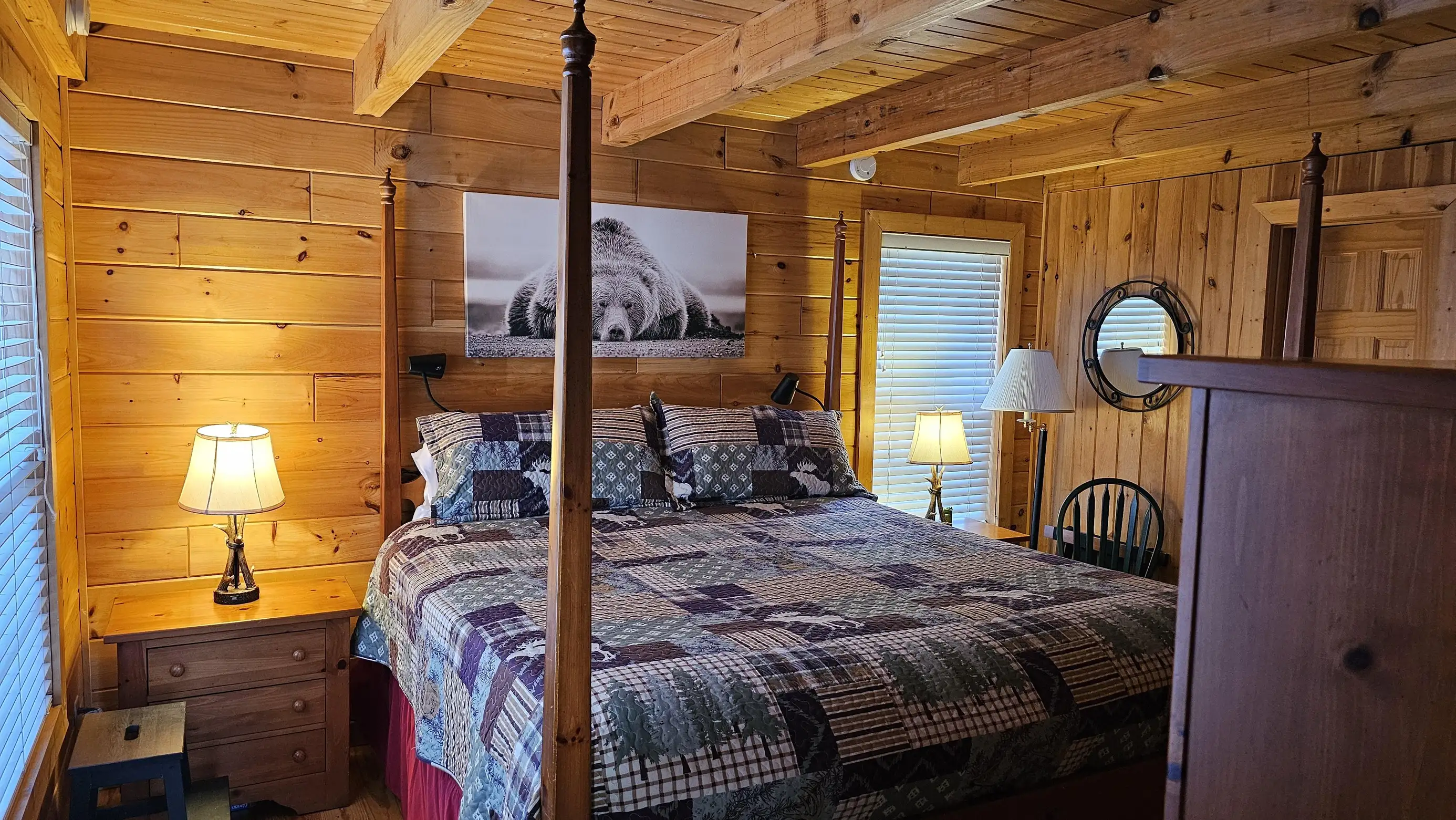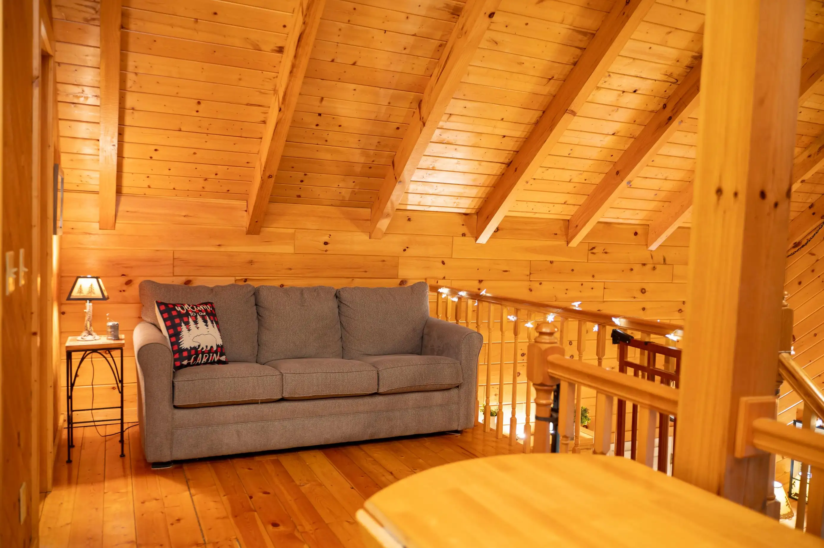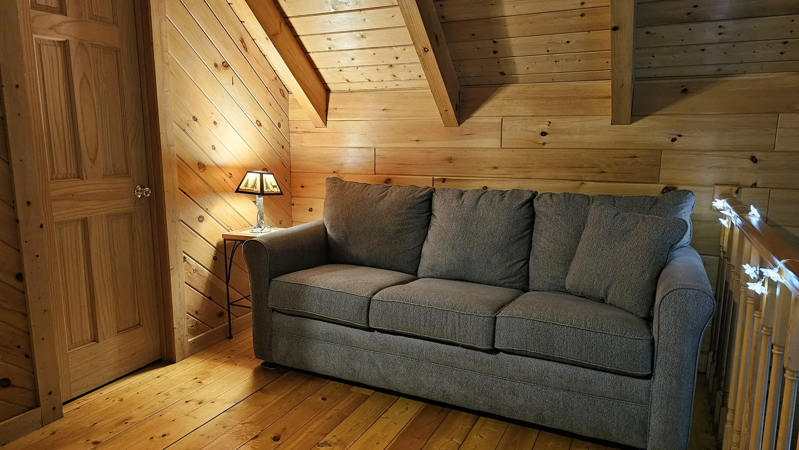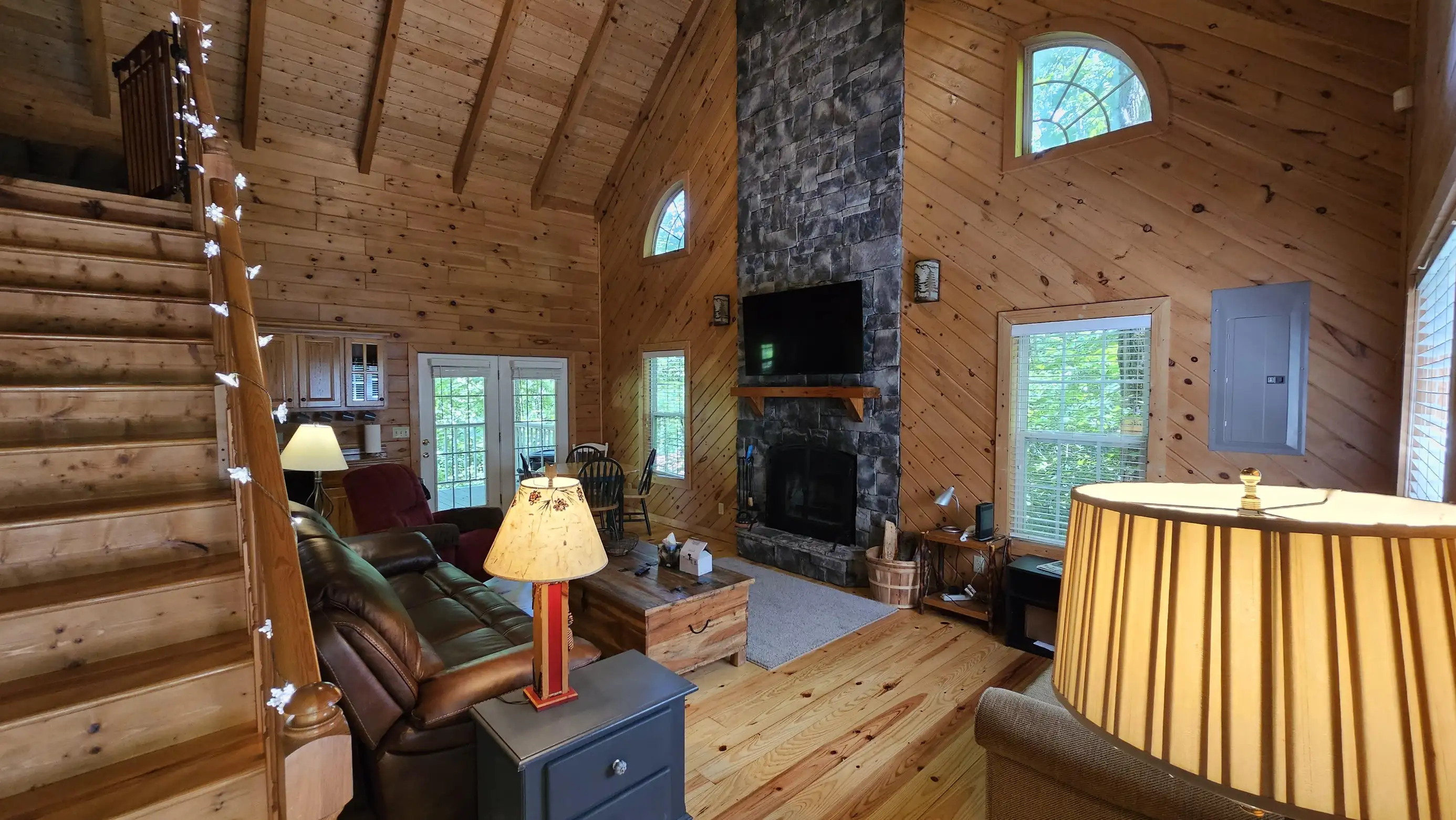 King size Bed down, Queen Bed up, and sleeper sofa in den. No steps on front porch to enter the cabin.