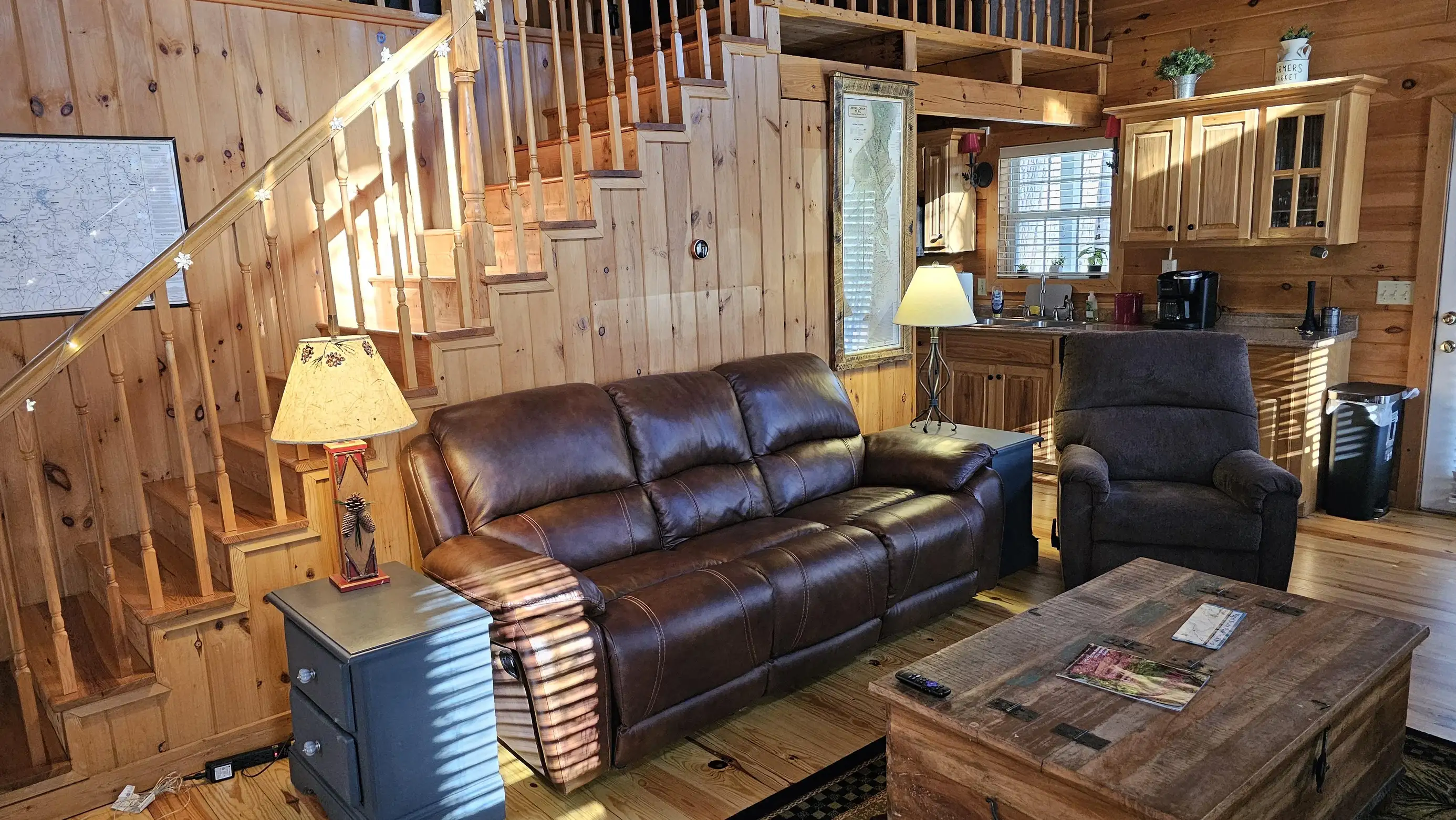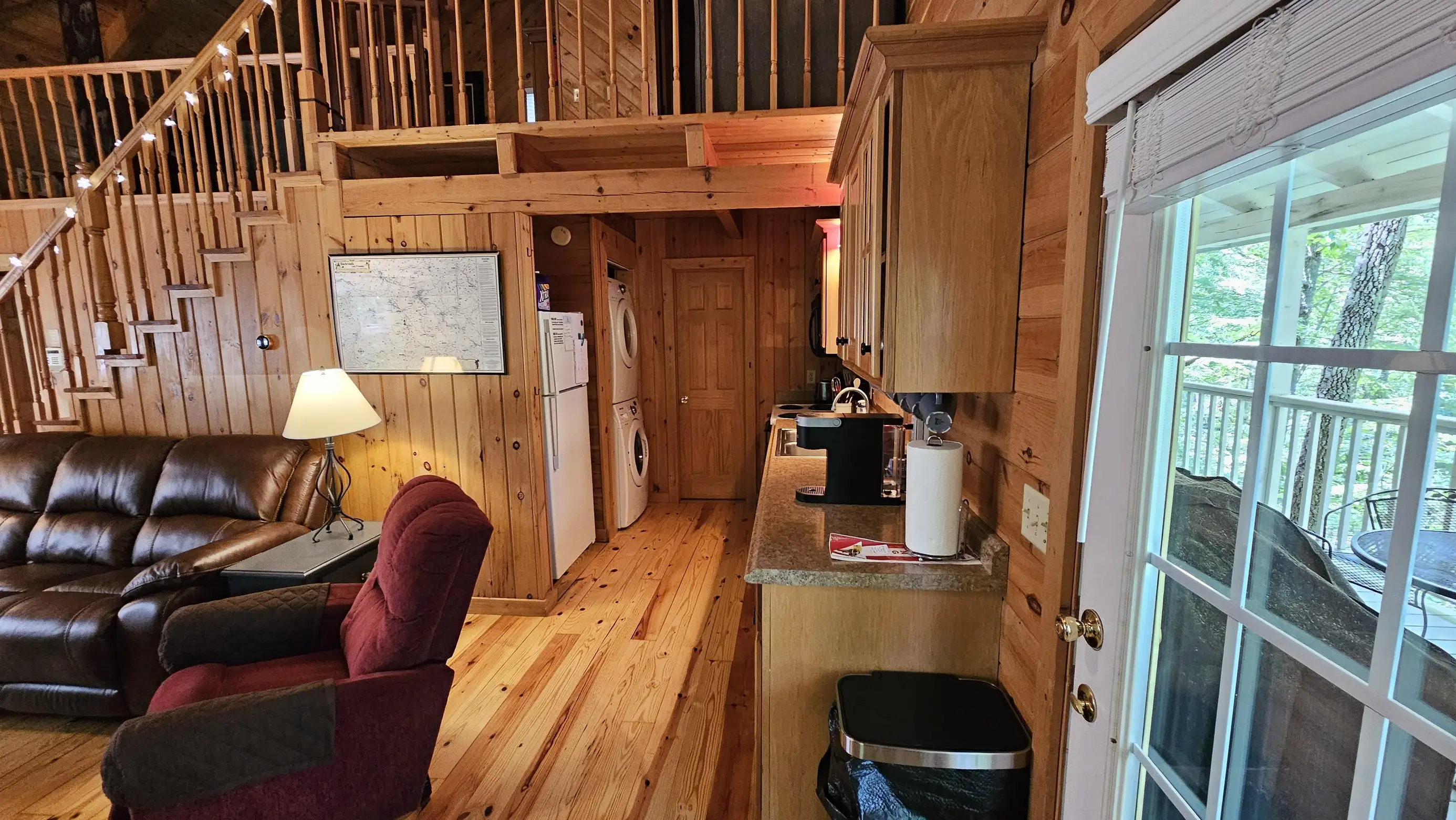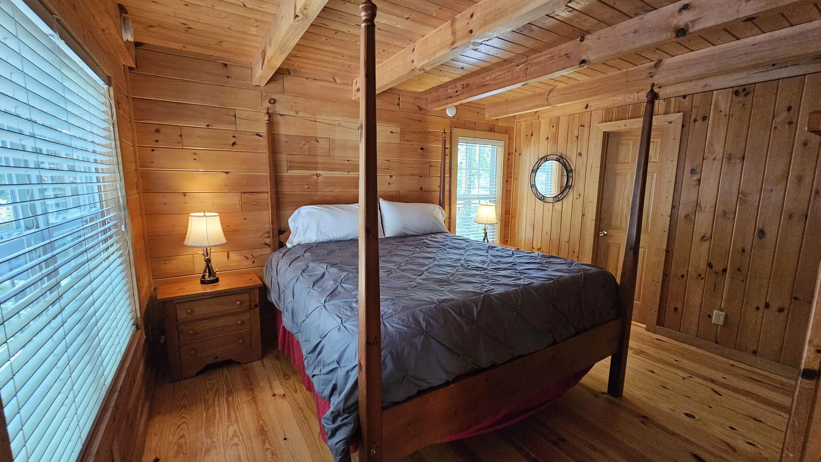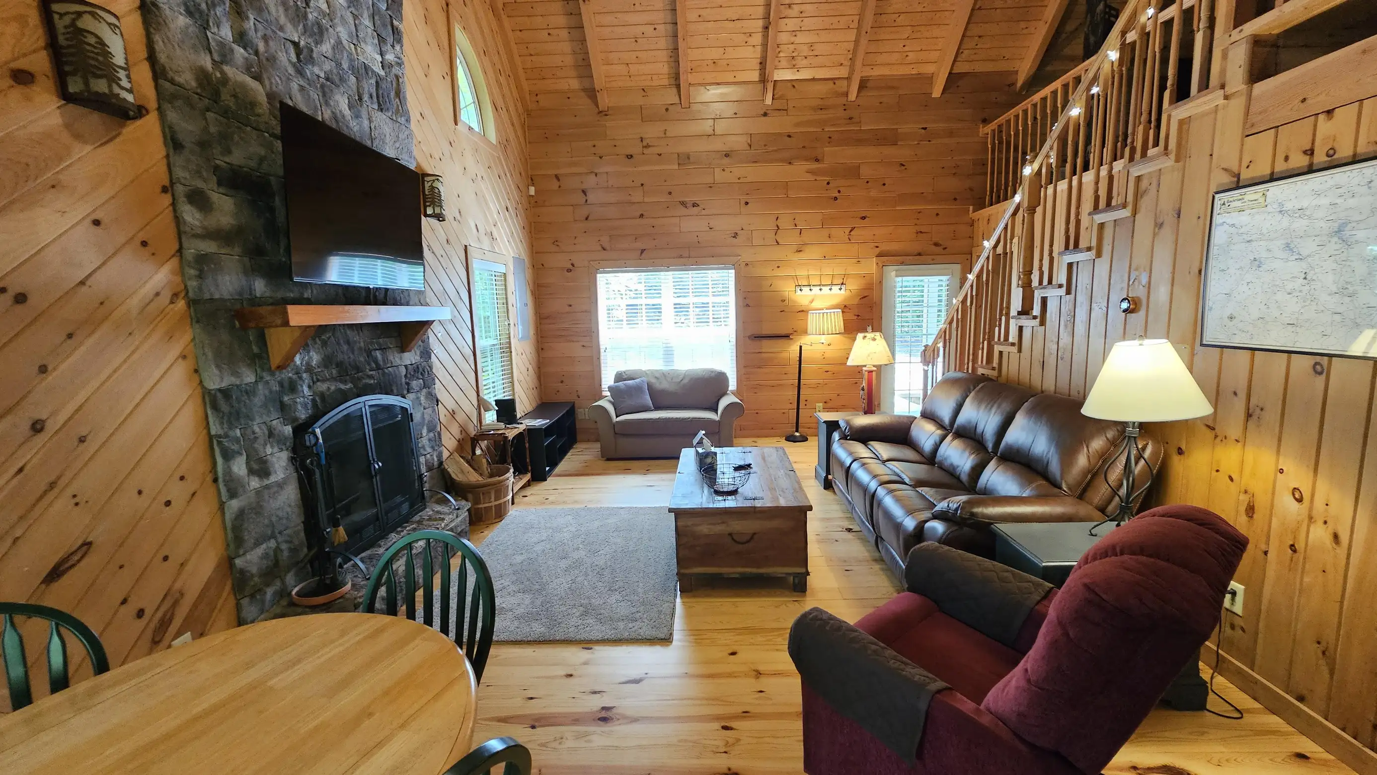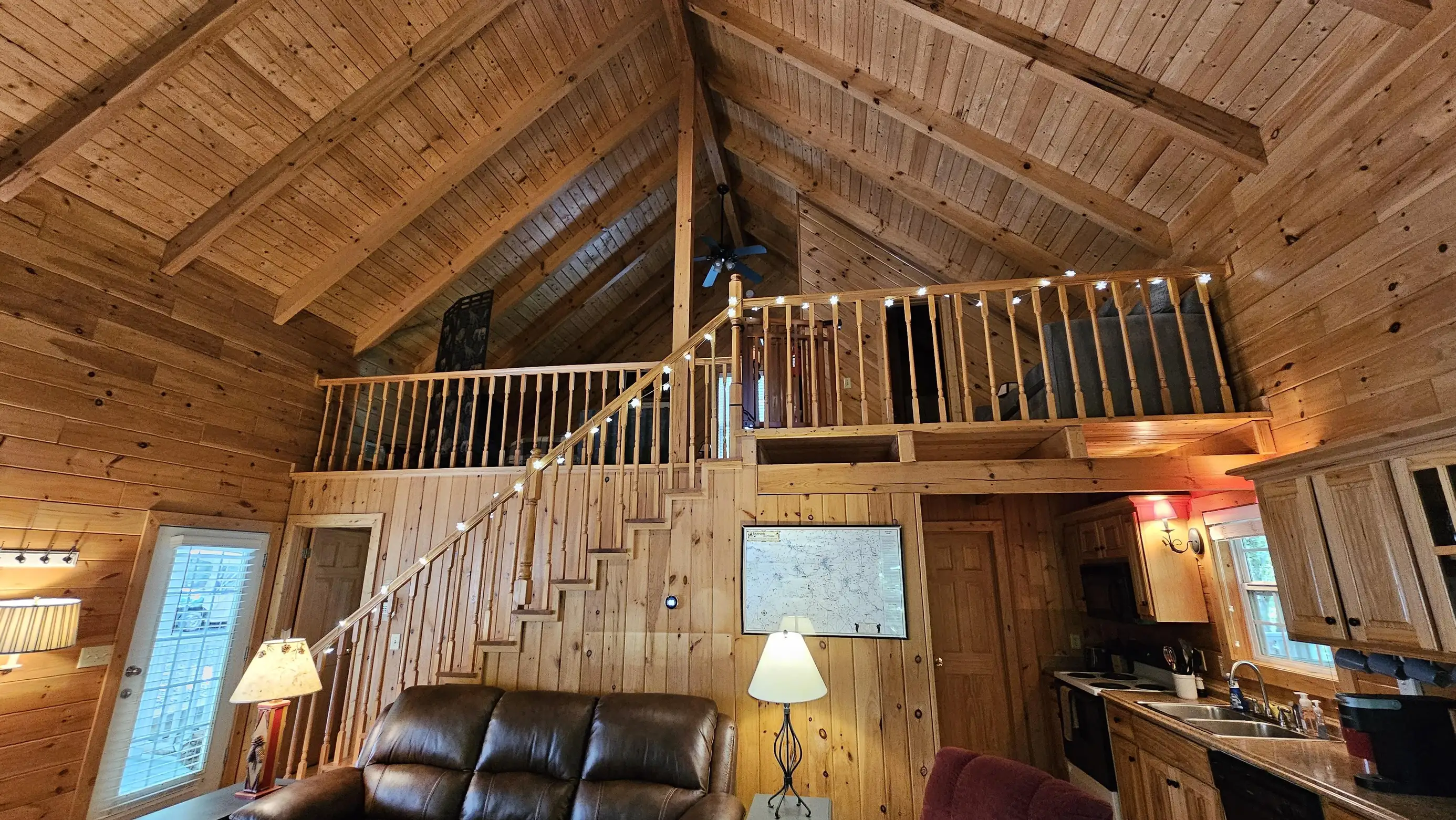 King size Bed down, Queen Bed up, and sleeper sofa in den. No steps on front porch to enter the cabin.