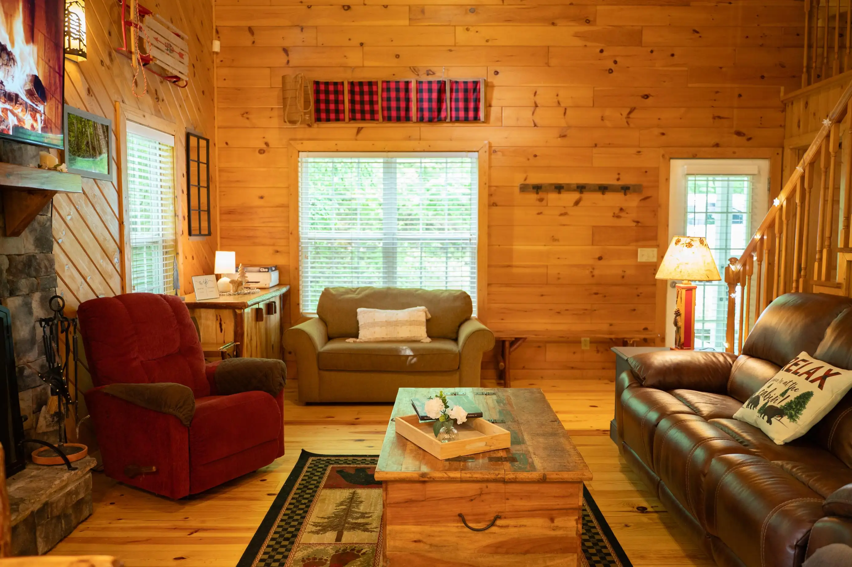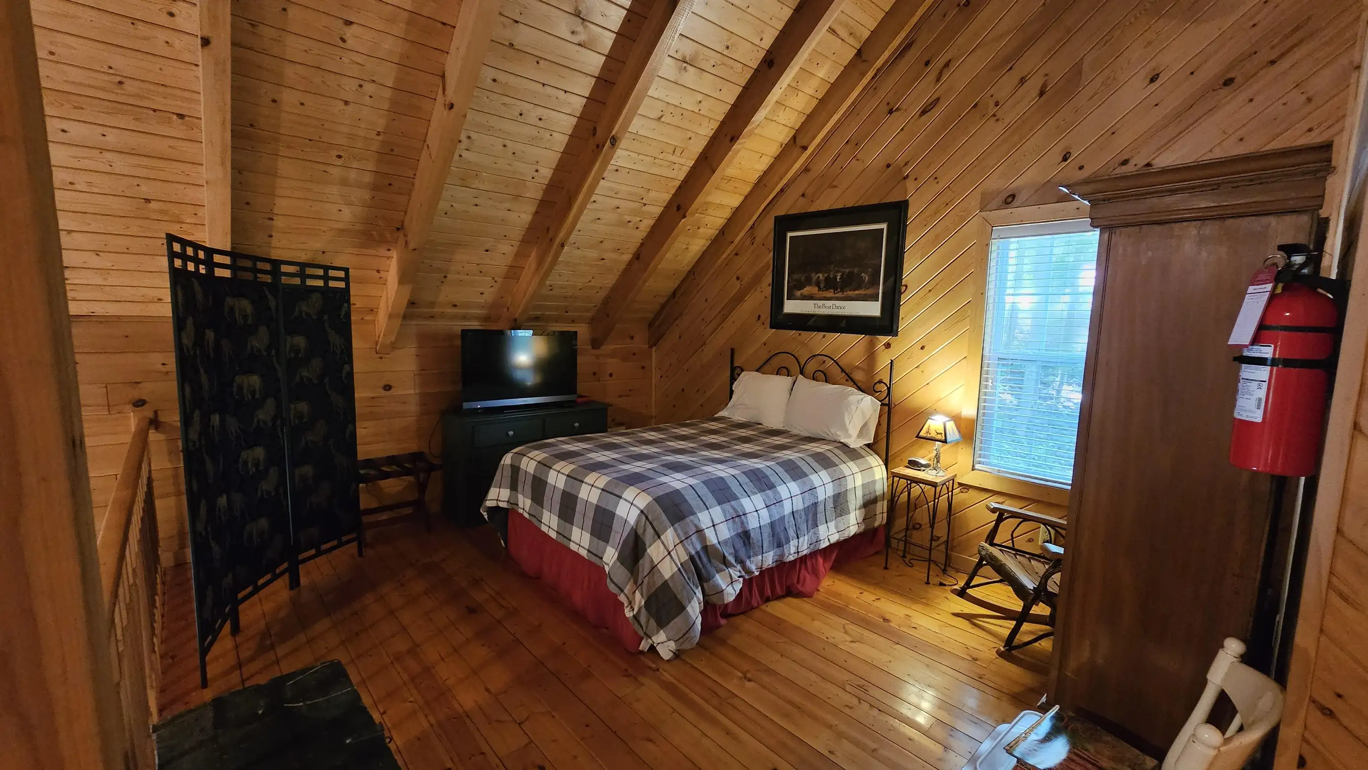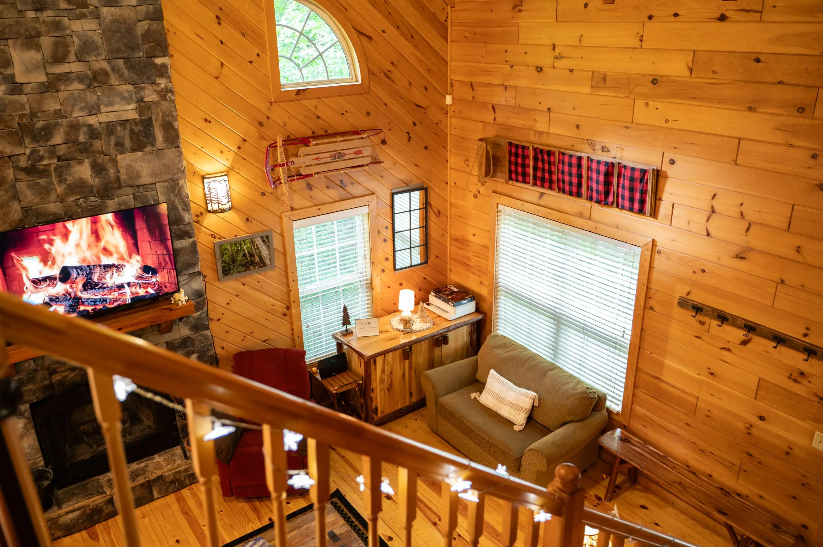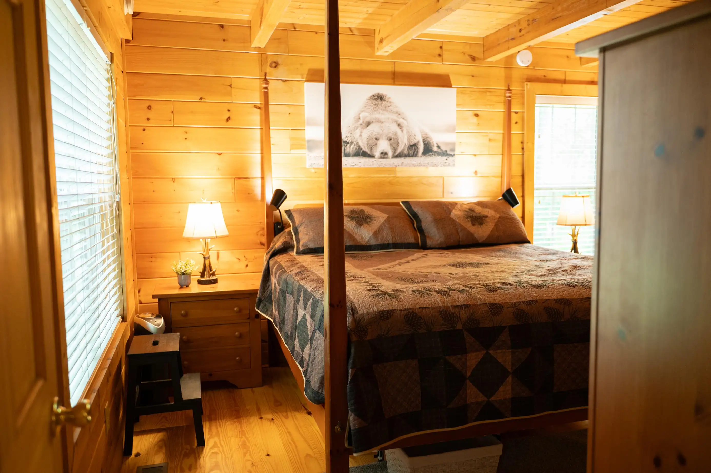 King size Bed down, Queen Bed up, and sleeper sofa in den. No steps on front porch to enter the cabin.