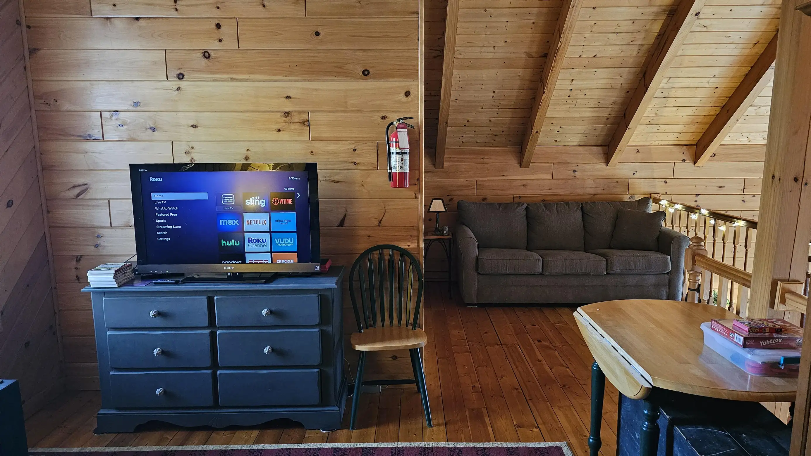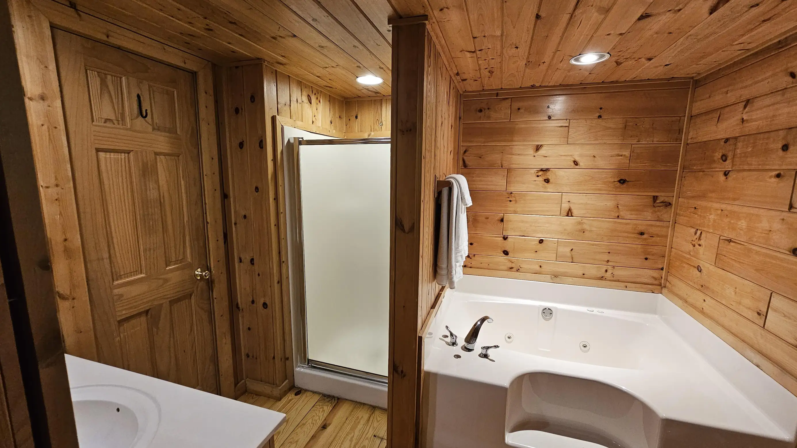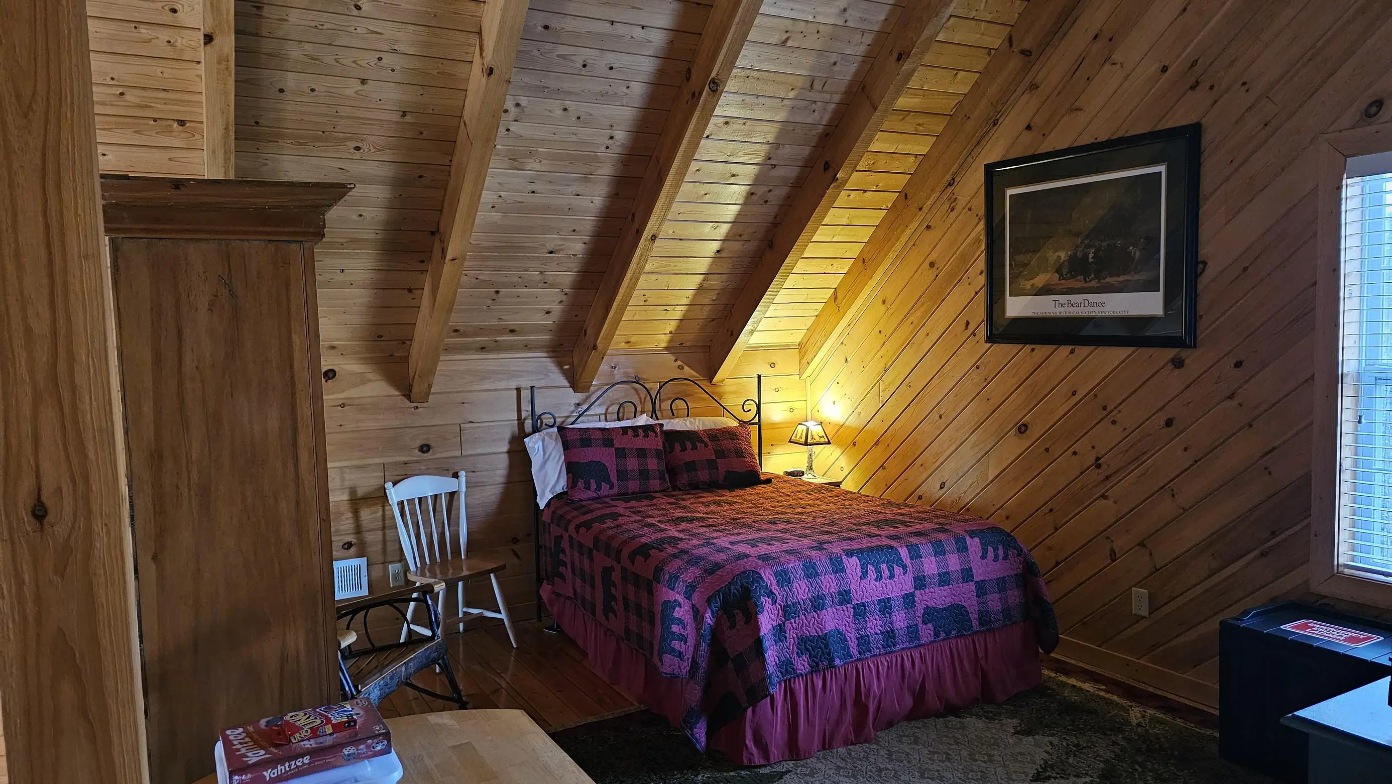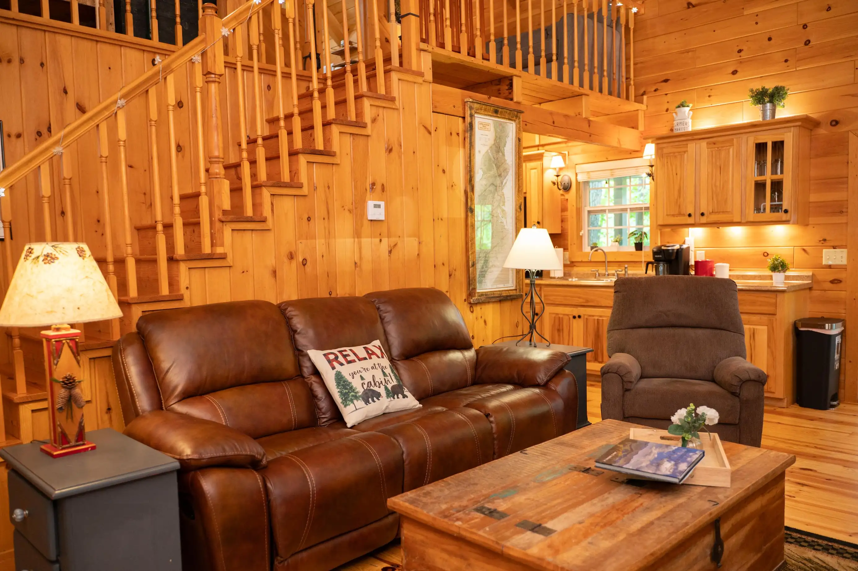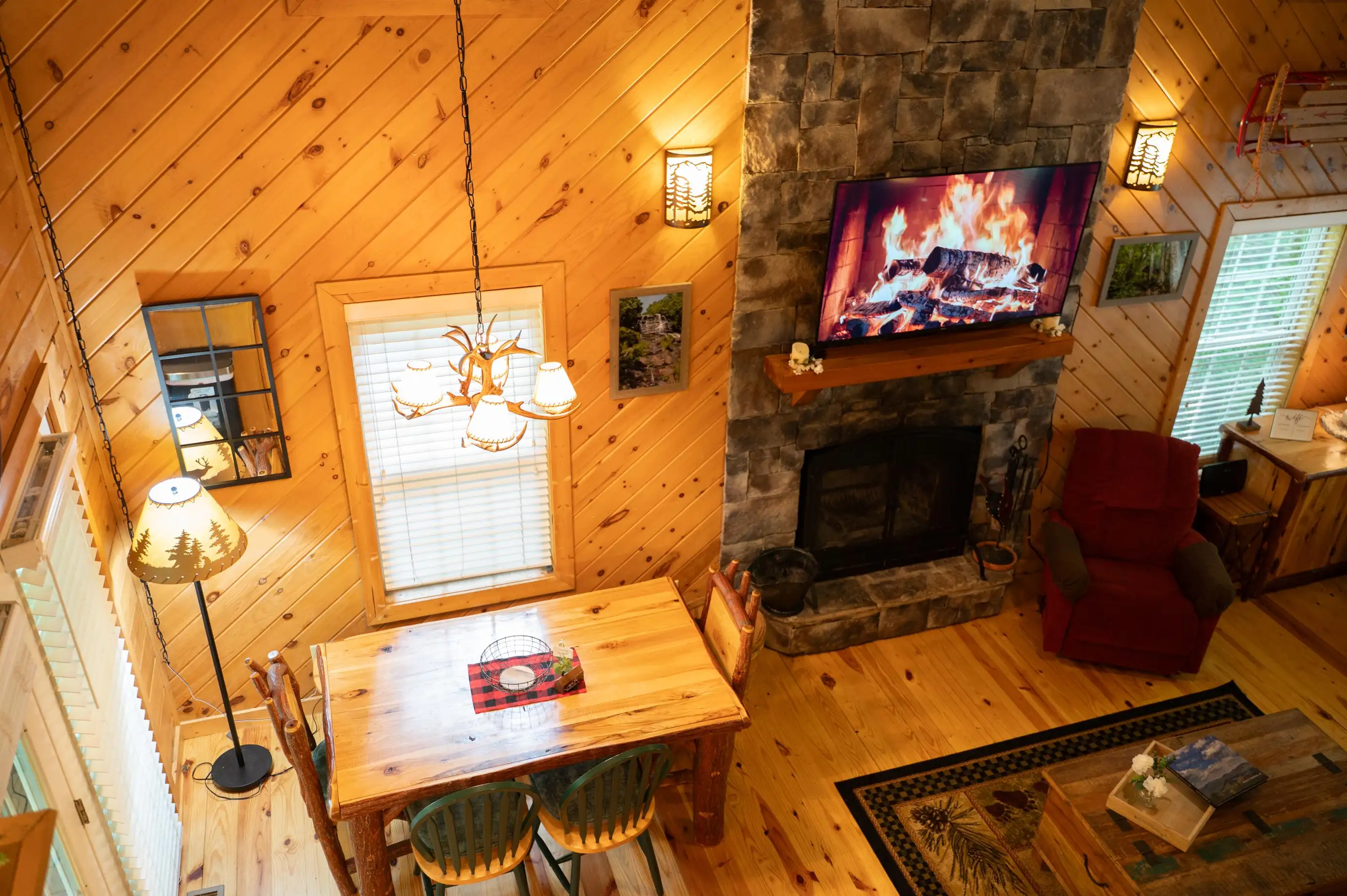 King size Bed down, Queen Bed up, and sleeper sofa in den. No steps on front porch to enter the cabin.