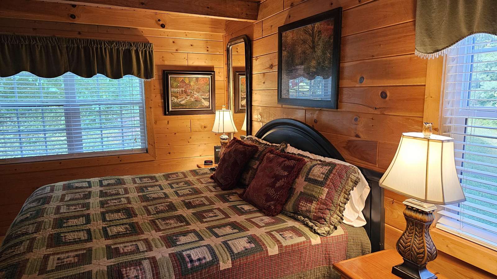 Lic. #007312 - Beautifully decorated in a cheerful, upscale country charm with sparkling clean accommodations with a spacious living area, well-appointed kitchen and dining area, two bedrooms ( a master with a king bed and a bath with a jacuzzi tub, a 2nd bedroom with a queen bed and another bath) and queen sleeper sofa in the living area and a trundle bed in the loft.. The cabin provides TV's in each bedroom, a wide-screen Smart TV with Netflix in the great room, cathedral ceiling a floor to ceiling stone fireplace, tongue and groove paneling walls and floors, books, magazines, games and WiFi which make the Iris cabin a relaxing get away for the entire family. A large covered porch, compete with grill, patio table and chairs, and large rockers provide ample space for enjoying a steaming cup of coffee in the morning while watching deer amble across the back lawn.